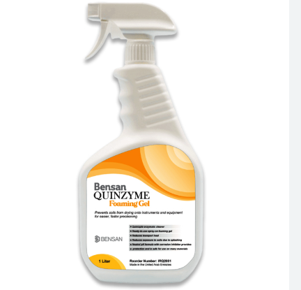 Safecare`s Bensan Quinzyme is an enzymatic detergent concentrate used for the manual andrnautomatic cleaning of medical instruments in CSSD and Endoscopy. The various enzymes ensurerna broad cleaning spectrum, leaving the instruments in crisp condition prior to sterilisation orrnhigh-level disinfection. The short washing cycles ensure maximum throughput and reducedrnoperational cost. The formulation is based on protease, lipase, amylase, cellulase and mannanasernas well as various tensioactive agents and maintain a high level of enzymatic activity up to 24rnhours after initial dilution.rn
