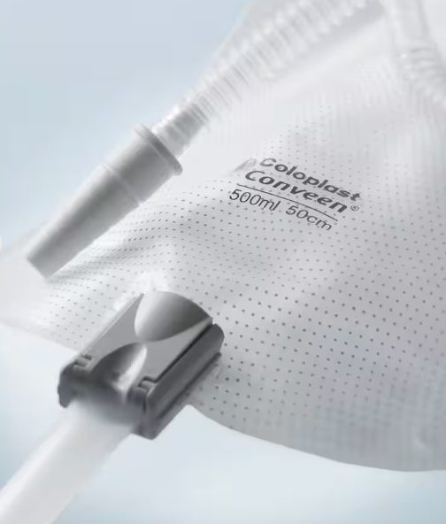 The Coloplast Conveen Security+ Leg Bag (Ref 051600) is a 500ml, sterile, non-latex urine collection bag designed for men with urinary incontinence. It features a clamp outlet, anti-kink tubing, and a 30cm tube length, and is designed to be worn on the leg for discreet urine management.
