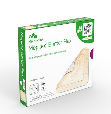 Mölnlycke Mepilex Border Flex 10x10cm (4x4 in) is an all-in-one, self-adherent soft silicone foam dressing designed to manage a wide range of exuding acute and chronic wounds, conforming to the body and minimizing pain during changes.
