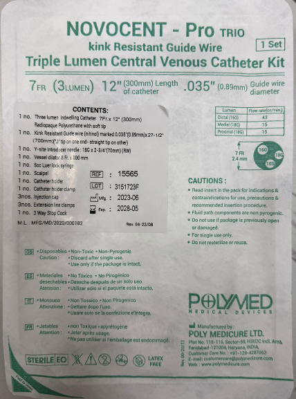 The Novocent-Pro Trio Triple Lumen Central Venous Catheter (CVC) Kit (Ref: 15565) is a sterile medical set used for accessing large central veins to administer multiple therapies simultaneously. This kit is designed for intensive care and surgical settings to provide long-term vascular access.