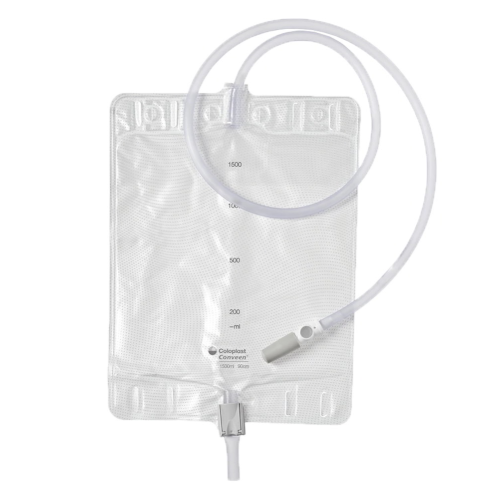 The Coloplast Conveen Standard 1500ml (product code 050620 or 5062) is a large-capacity urinary drainage bag designed for both daytime and overnight use. It features a clamp outlet for secure closure and a 90cm anti-kink tube, making it suitable for bedside drainage or as a large leg bag.