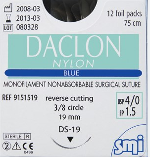The SMI Daclon Nylon Blue 4/0 DS 19 is a non-absorbable, monofilament surgical suture made of polyamide (nylon), commonly used for general soft tissue approximation and skin closure.