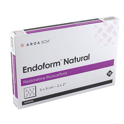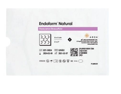 The Endoform Natural soft tissue 5x5 cm is a type of restorative bioscaffold, specifically an advanced collagen wound dressing, used for the management of various acute and chronic wounds. It is derived from ovine (sheep) forestomach and provides a natural extracellular matrix (ECM) to support the body's own tissue regeneration processes.