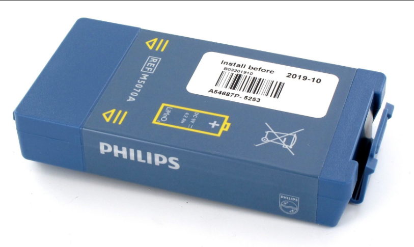 The Philips HeartStart battery (model number M5070A) has an operating time of 4 hours or a minimum of 200 shocks. The shelf-life of this battery is five years, and it is guaranteed to last four years from the time of installation.