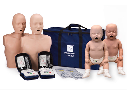 Prestan Professional TAKE2® Kit consist of two(2)Professional Adult Manikins with CPR Feedback,two(2)Professional Infant Manikins with CPR Feedback and two(2) AED UltraTrainers with English/Spanish Languages (AA Batteries not included).