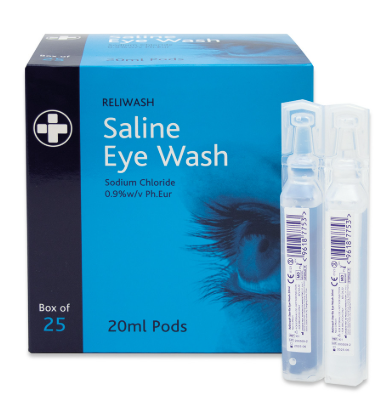 Reliwash Sterile Saline Eye Wash (20ml) is a single-use pod designed for immediate first aid to flush out dust, dirt, and other minor irritants from the eye.