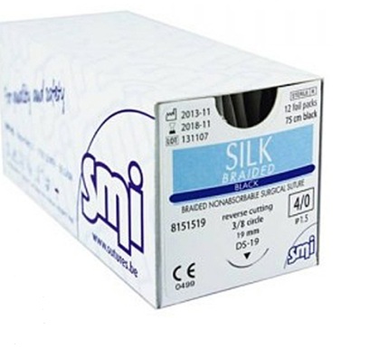 The SILK BRAIDED BLACK 4/0 DS19 is a specific type of non-absorbable surgical suture made of natural silk fibers, typically used for general soft tissue closing and ligation. The DS19 refers to the size and shape of the attached needle.